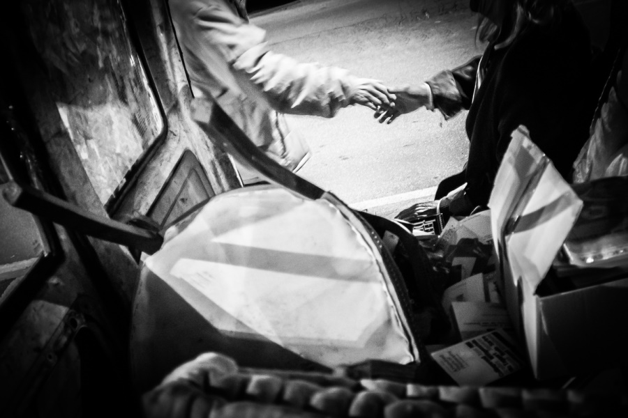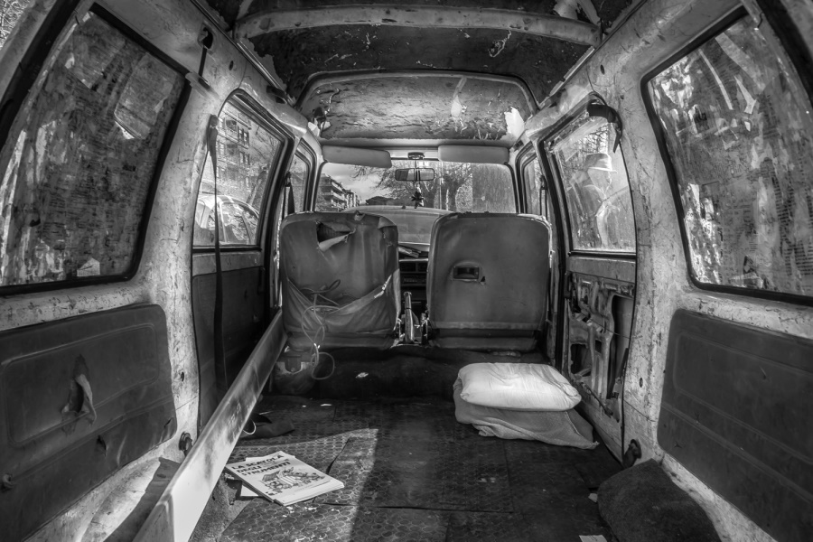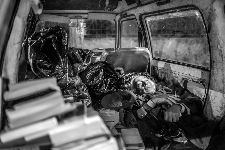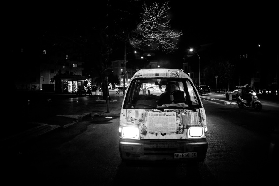 E quando cala la notte, lui resta da solo nel suo furgone, e nelle notti